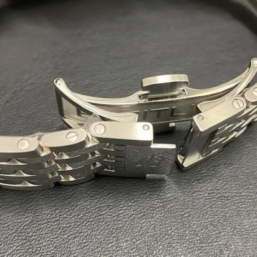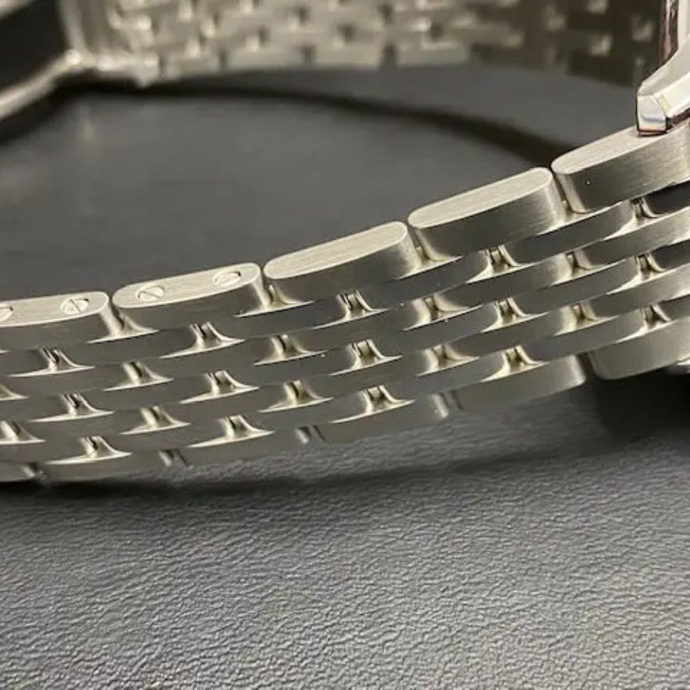 Encased in brushed and polished stainless steel, it showcases a bidirectional notched bezel with the iconic Navitimer slide-rule, historically used for flight calculations. The dial presents three contrasting black chronograph subdials (elapsed seconds, 30 minutes, 12 hours) and a framed date at 6 o’clock. Baton indices and luminous hands ensure readability in all lighting conditions, while the red-tipped chronograph hand highlights its precision timing heritage.