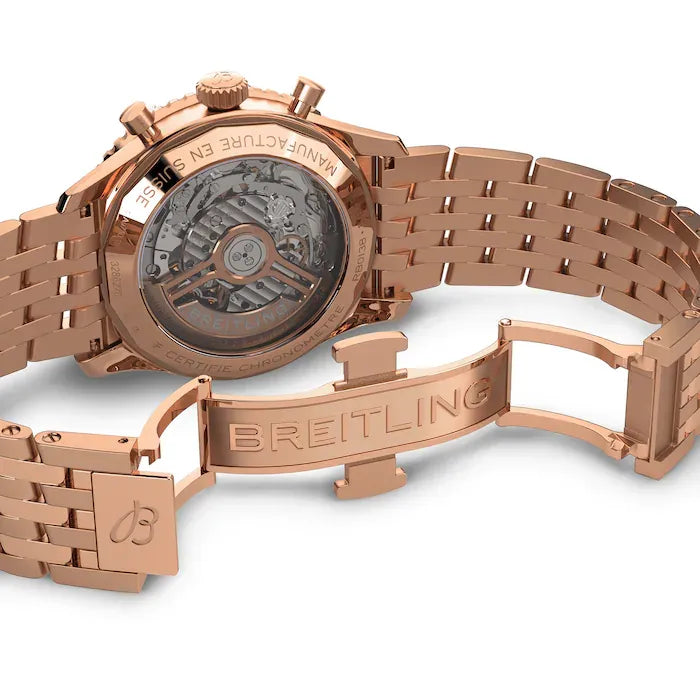 The B Navitimer B01 Chronograph 43 is a striking fusion of aviation heritage, technical mastery, and contemporary luxury. Its 43 mm case, crafted from solid 18K red gold, exemplifies modern chronograph design while honoring one of the most iconic pilot watches in history.