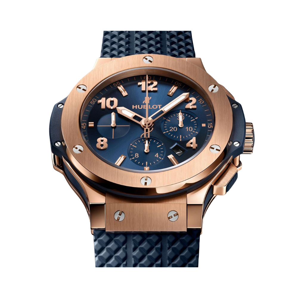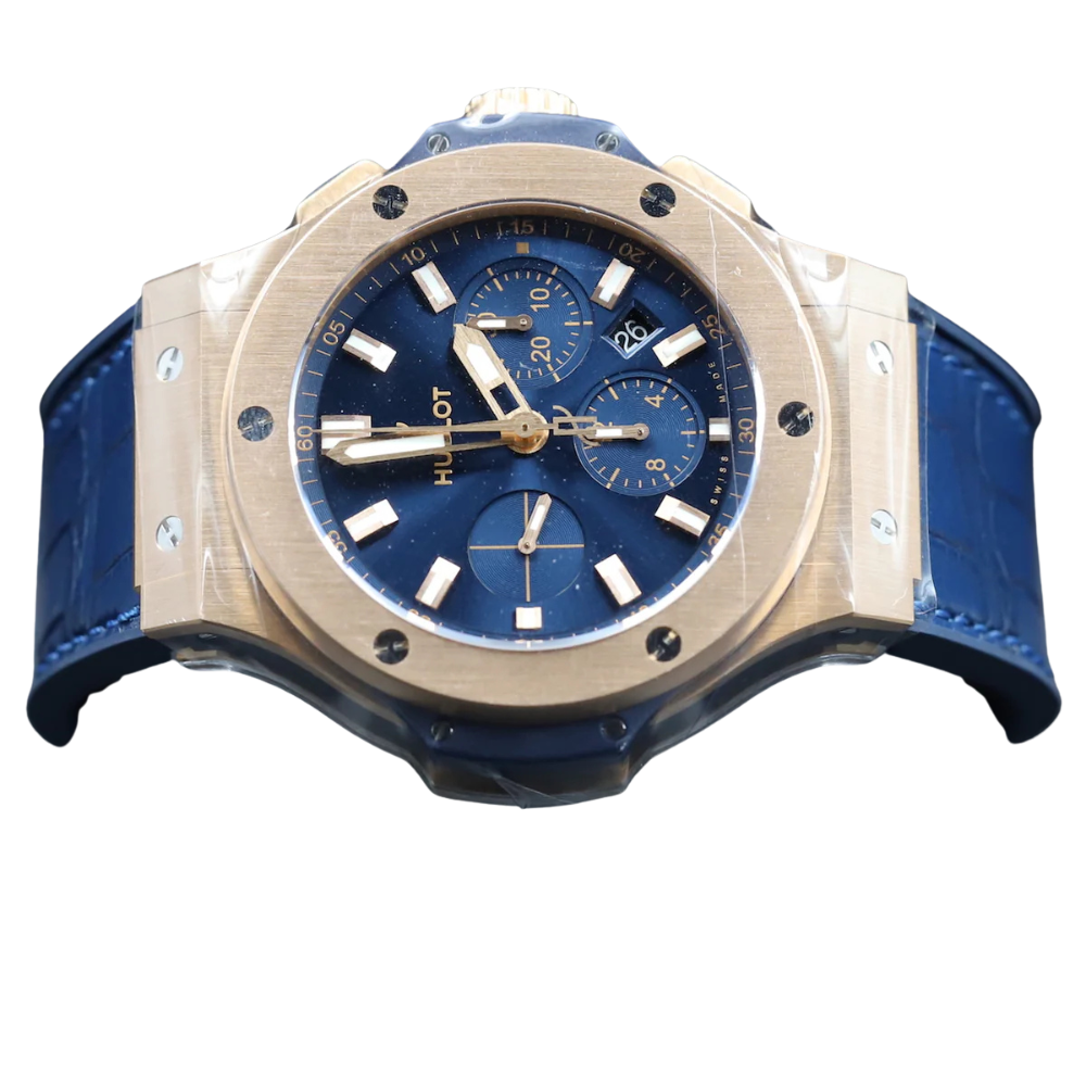 The H Big Bang Gold Blue Ref. 301.PX.7180.LR exemplifies H’s renowned “Art of Fusion” by blending sporty design with luxurious craftsmanship. Its 44 mm case in 18K polished and satin-finished rose gold is paired with a striking blue sunray dial and a matching blue alligator leather strap lined with black rubber. The result is a bold yet refined timepiece that commands attention.