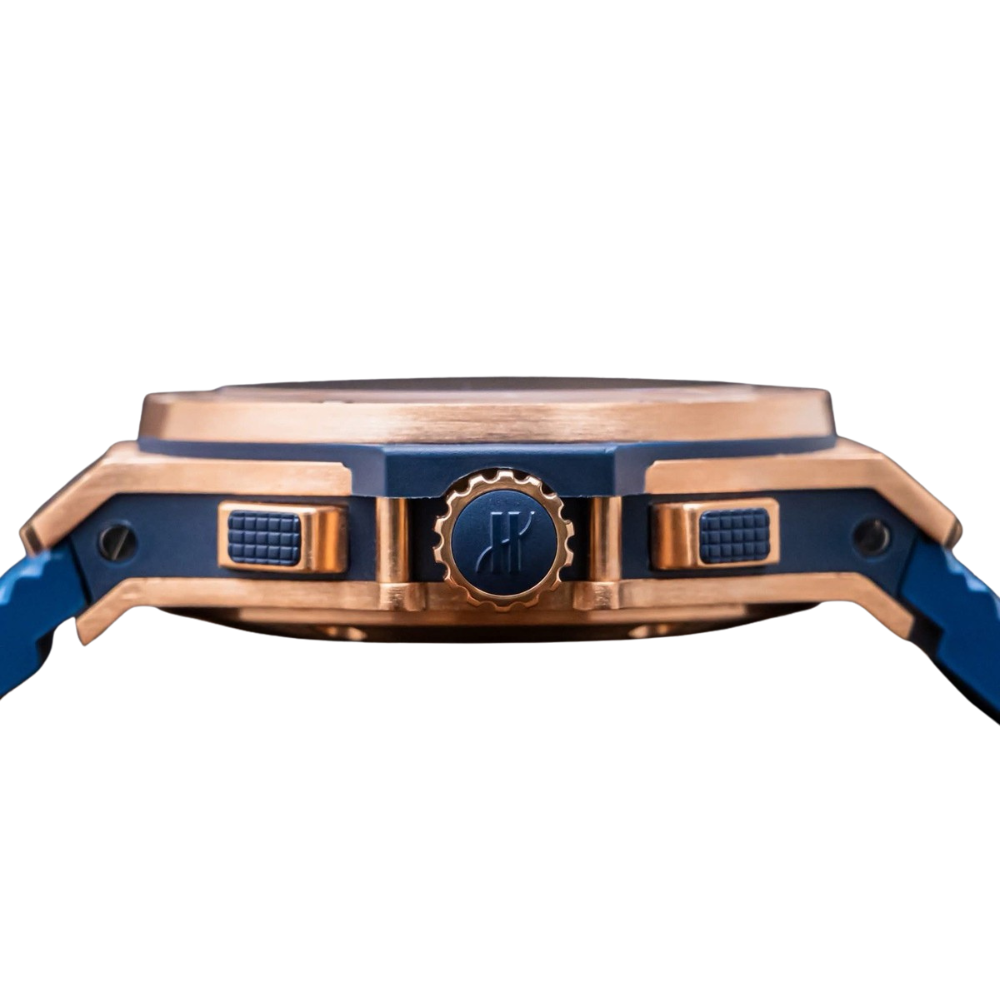 Strap: Blue alligator leather stitched on black rubber, 18K rose gold & stainless steel deployant buckle