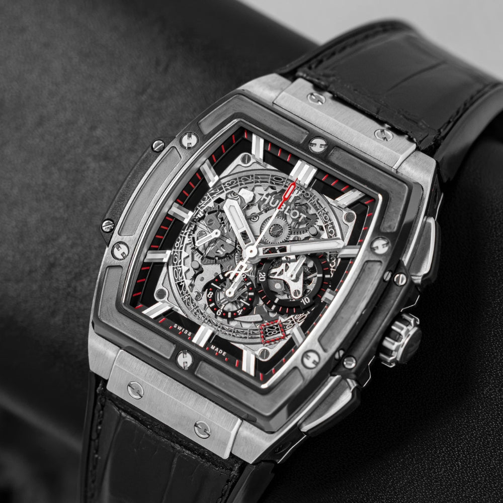 The H Spirit of Big Bang Titanium Ceramic Ref. 601.NM.0173.LR is a striking reinterpretation of H’s signature design, presented in a bold tonneau-shaped case that perfectly embodies the brand’s “Art of Fusion” philosophy. Crafted from lightweight titanium and polished black ceramic, this 51 x 45 mm chronograph represents innovation, power, and avant-garde craftsmanship at its finest.