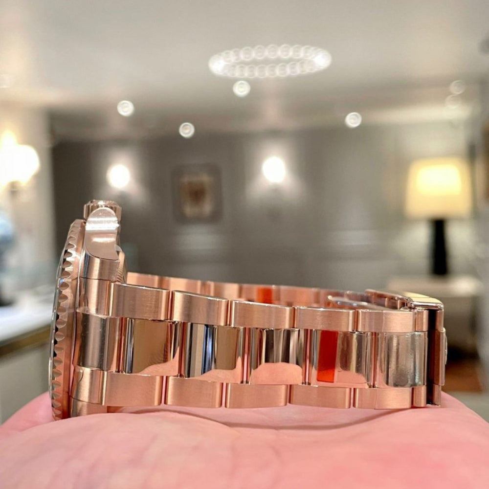 The RL GMT-Master II “Rootbeer” Ref. 126715CHNR-0001 blends exotic luxury with professional-grade functionality. Its Everose gold construction, warm brown-and-black ceramic bezel, and black Chromalight dial create a distinctive and refined look, while the Calibre 3285 guarantees precision and durability. A symbol of both exploration and sophistication, this GMT-Master II is a coveted choice for world travelers and collectors alike.