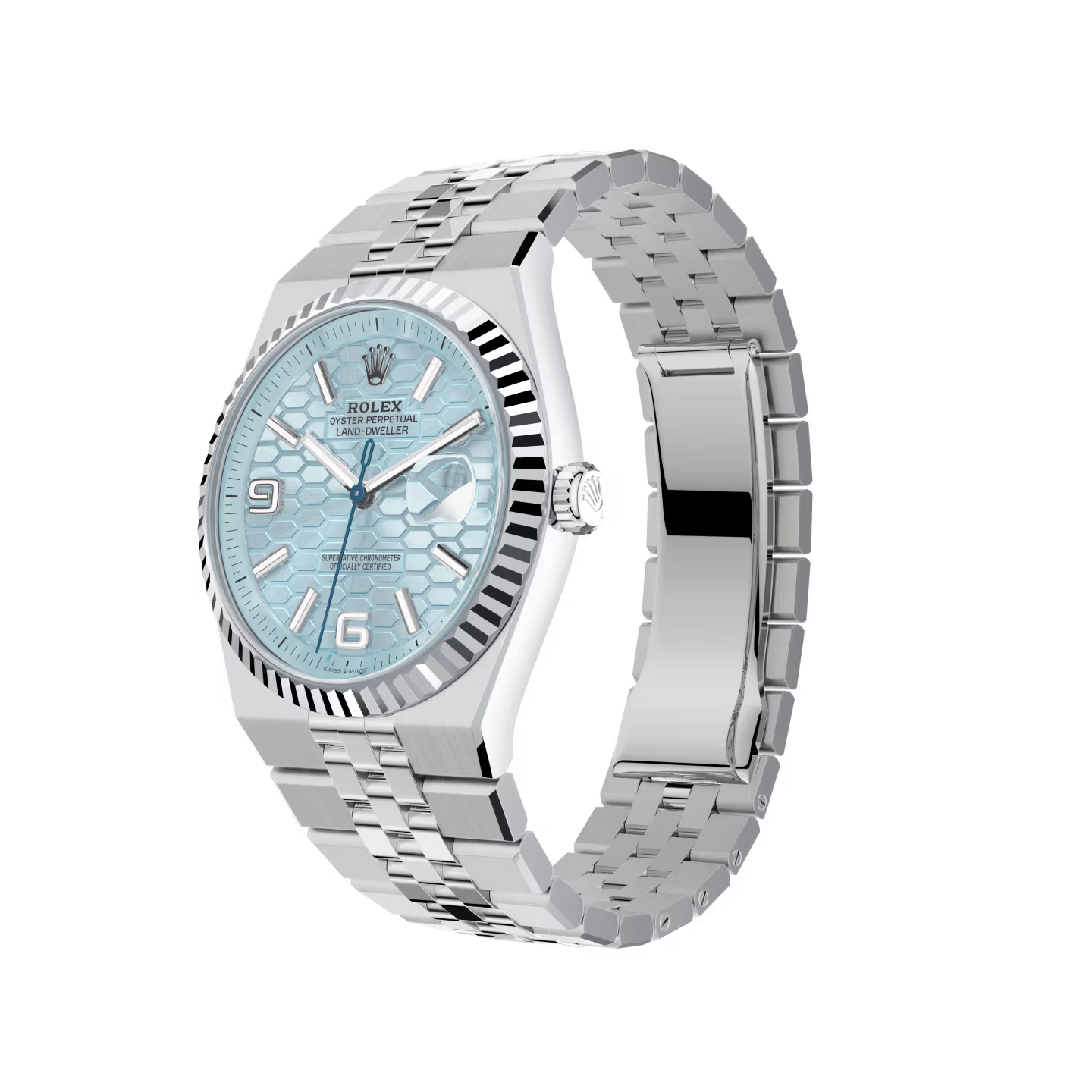 The RL Land-Dweller 40 Ref. 127336-0001 is a stunning new model crafted in 950 platinum — a first for the Land-Dweller collection. This watch features a blue dial with radial motif, elegant Roman numerals, and RL’s signature fluted bezel also rendered in platinum. It is the epitome of prestige, elegance, and mechanical mastery.