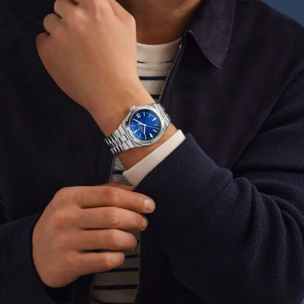 Dial: Sunburst satin-finished lacquered blue with 18K gold hour markers and hands, highlighted by blue SuperLuminova®, date window at 3 o’clock